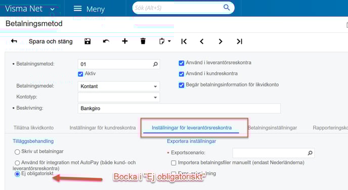 - Klicka på fliken "Inställningar för leverantörsreskontra" och bocka i "Ej obligatoriskt" under Tilläggsbehandling. Se bild.