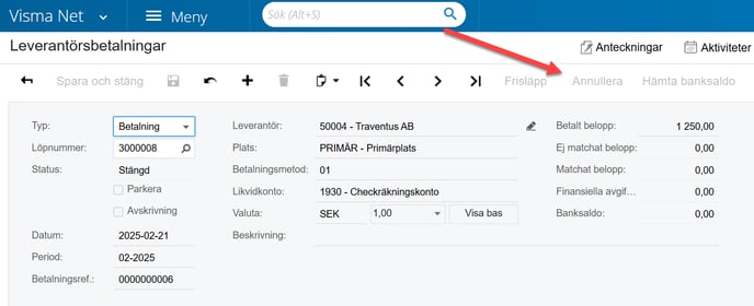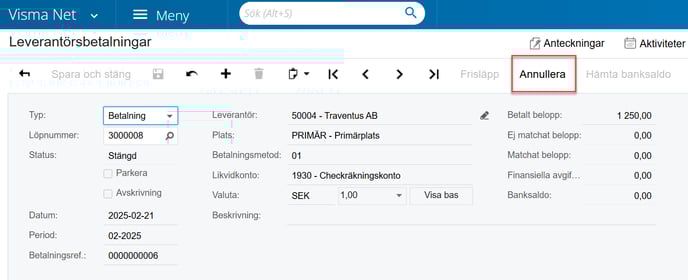 Om du har gjort en felaktig leverantörsbetalning i Visma och sedan korrigerat den direkt i banken så återrapporteras den ändringen inte till betalningen i Visma. Vi behöver då annullera betalningen och därefter skapa upp en ny korrekt betalning.