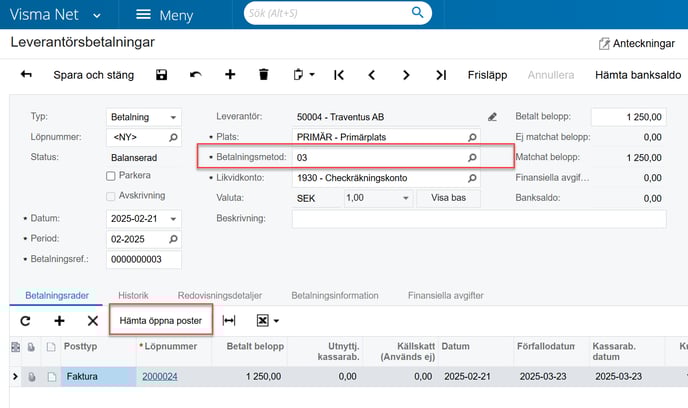 - Skapa nu upp en ny manuell leverantörsbetalning med betalningsmetod 03 och hämta upp leverantörsfakturan.
