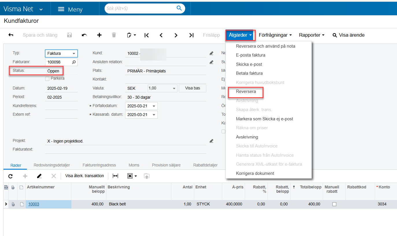 Alt 1: Sök upp fakturan, klicka på åtgärder och *reversera. Nu har en kreditfaktura skapats upp med status balanserad (ej bokförd). Kontrollera datum och alla parametrar och frisläpp (bokför) när allt ser bra ut.