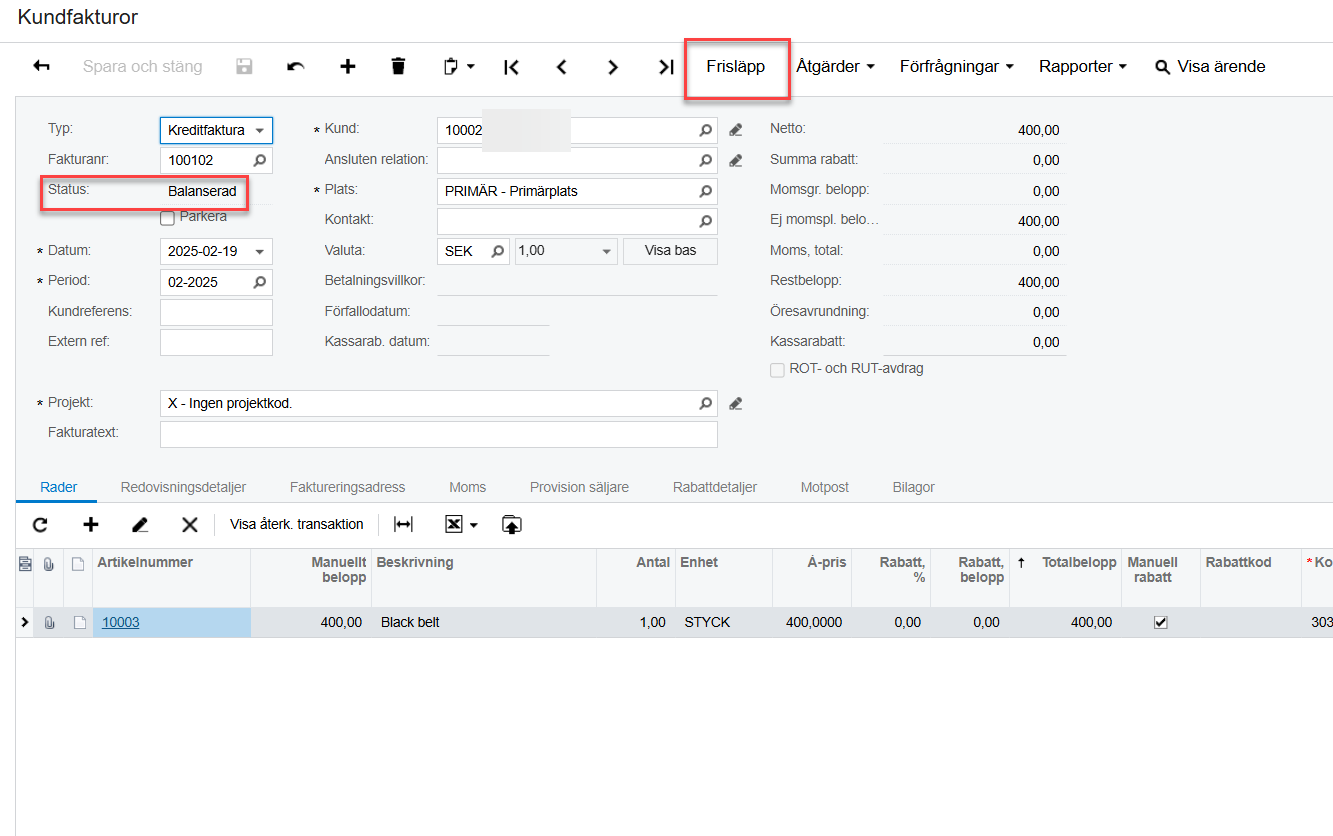 *Notera att numera finns det en funktion på kundfakturor under åtgärder vid namn reversera använd på nota. Utför man denna åtgärd så skapas en kreditfaktura och så fort man frisläpper krediten så kommer både kreditfakturan och debetfakturan att stängas per automatik.
