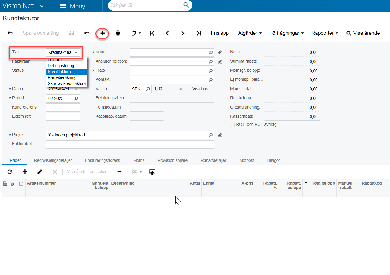Alt 2: Självfallet går det även att skapa upp en kreditfaktura manuellt. Däremot behöver man då lägga in all information manuellt på fakturan.