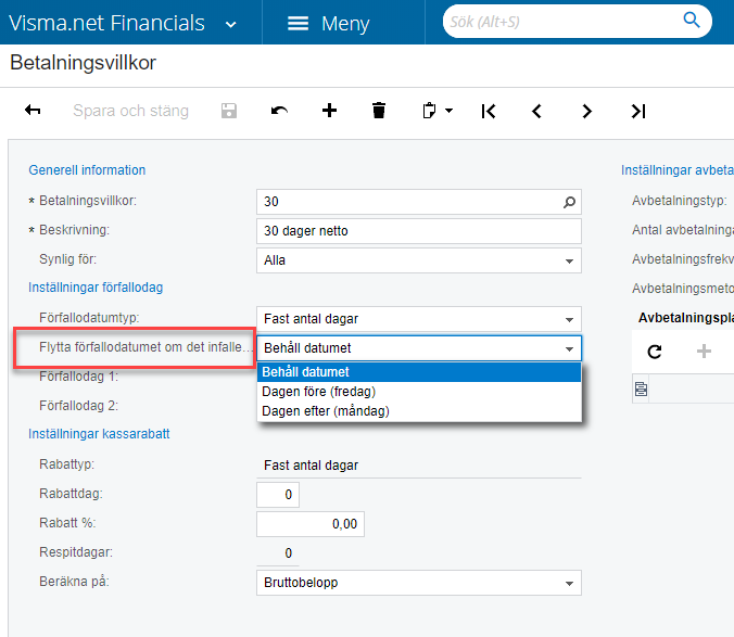 I fönstret Betalningsvillkor (CS206500) finns nu fältet Flytta förfallodatumet om det infaller på helgen.