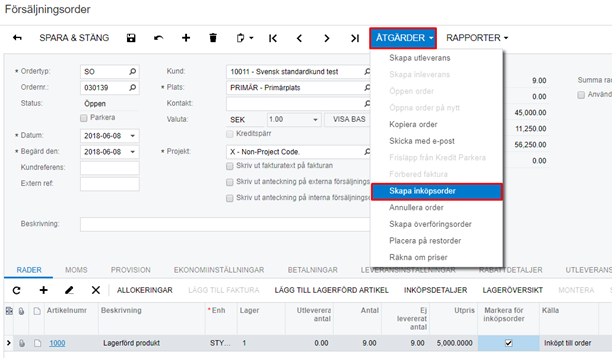 5. Klicka på "Åtgärder" och välj "Skapa inköpsorder"
