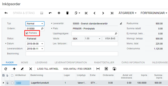 8. Nu navigerar systemet automatiskt till "Inköpsorder" med typ "Normal" och all information ifylld