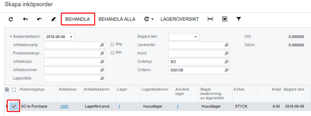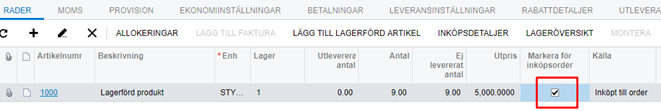 2. Kryssa i rutan "Markera för inköpsorder" på raden