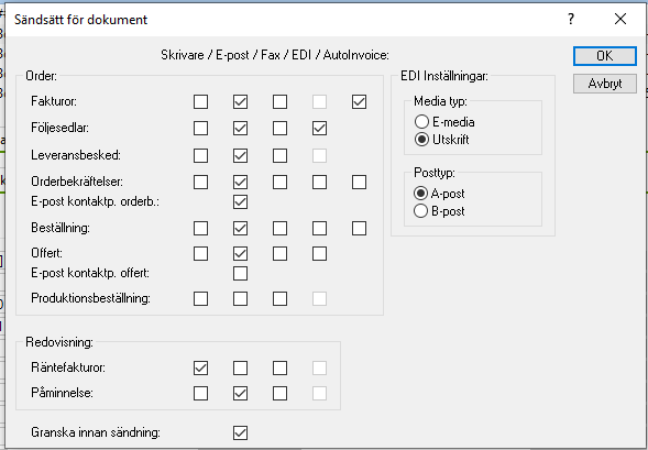 Dubbelklicka i detta fönster för att få upp inställningarna för att skicka dokument (se bild nedan). Här kan man ange hur de olika orderdokumenten ska skickas ut från Visma. För varje dokumenttyp finns en rad där du enkelt klickar i hur kunden vill ha dokumenten skickade till sig, via Skrivare, E-post, EDI eller Autoinvoice.