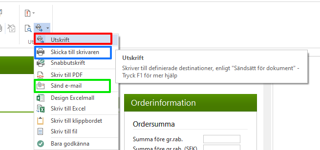 Man ska alltså inte använda knappen "Skicka till skrivaren" (blå markering på bilden) som det är lätt att blanda ihop med. Knappen Skicka till skrivaren överskriver sändsättet på kunden och väljer just att skicka dokumentet direkt till skrivaren så att du får ut ett pappersdokument i handen istället (och det finns ju tillfällen då man faktiskt vill ha det så då kan man använda denna).