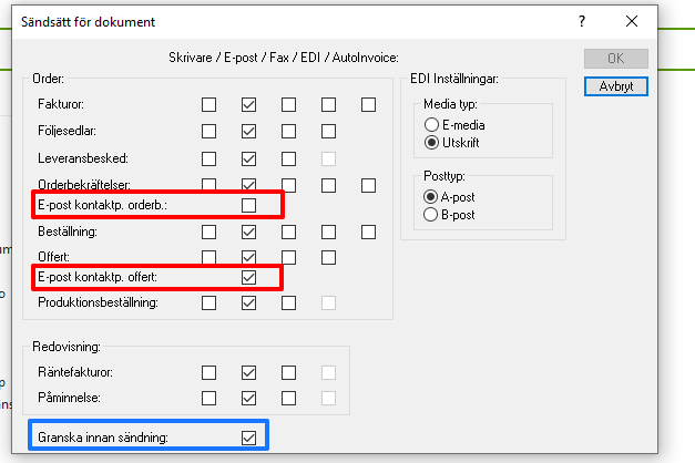 Om man kryssar i "Granska innan sändning" (se blå markering nedan) så kommer mailklienten att öppnas innan du skickar dokumenten så att du kan kontrollera dem. Om detta inte är ifyllt så kommer mailen att skickas direkt till den mailadress som hämtas, vilket kan vara fördelaktigt om man ska skicka många mail samtidigt.