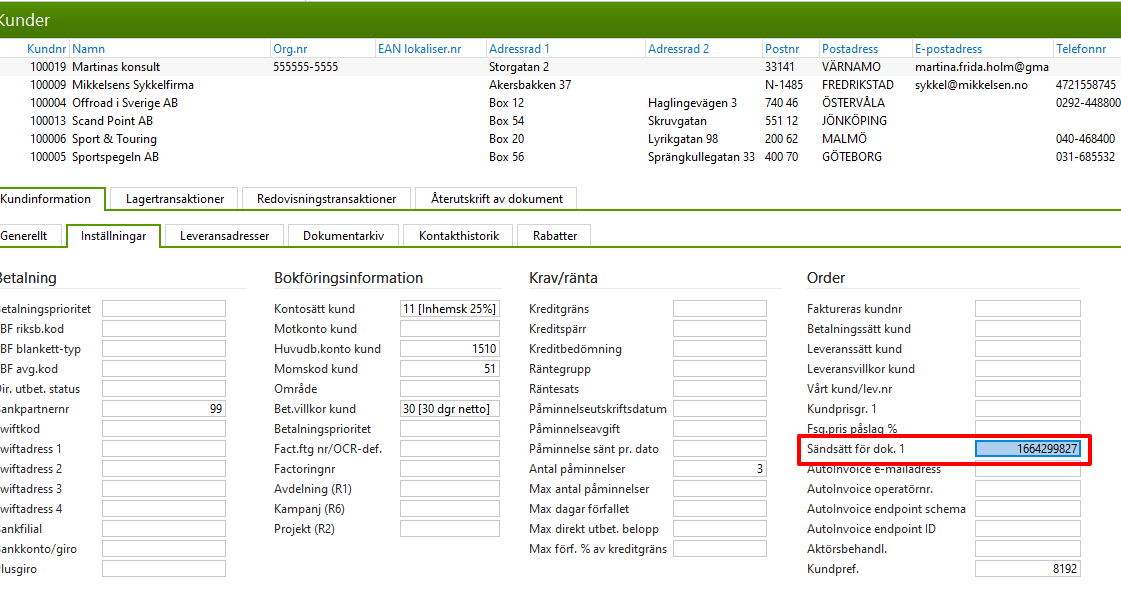 På kund-/leverantörsregistret finns ett fält som heter "Sändsätt för dok.". I standard-uppsättet för Visma Business ligger fältet under fliken Kundinformation/Inställningar och området Order i Kundregistret (se bild nedan).