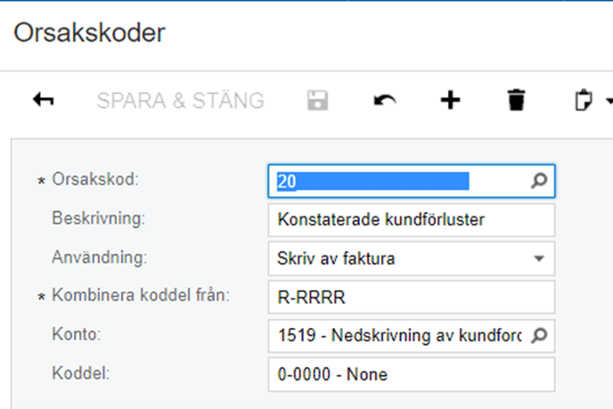 Det gör vi under Kundreskontran – Egenskaper – Orsakskoder