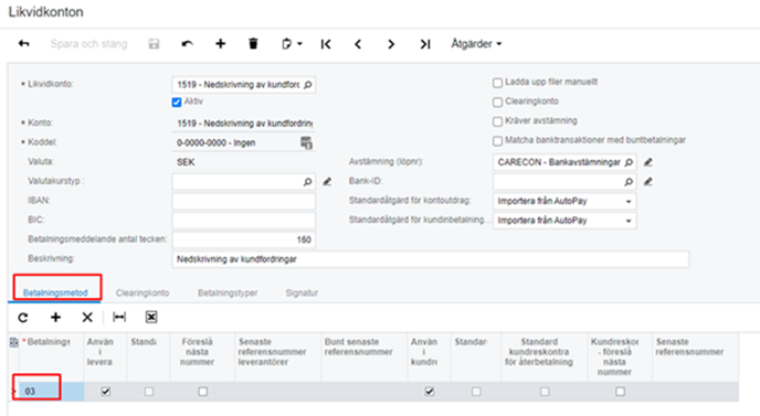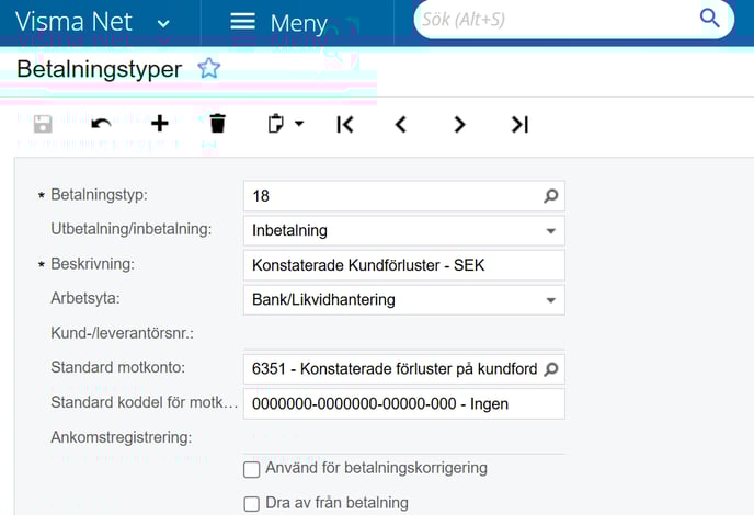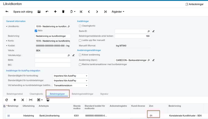 Koppla på de två betalningstyperna ni skapade under fliken betalningstyp, se till att betalningstyp Konstaterade kundförluster får Zon 01 på sig med.