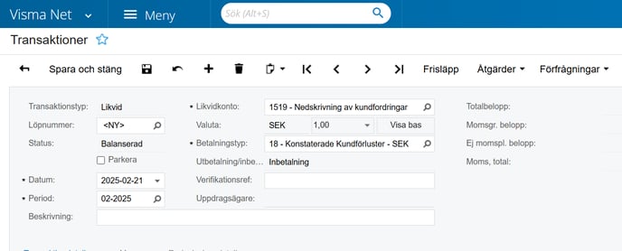 Välj likvidkonto: 1519 och Betalningstyp: Konstaterade kundförluster.
