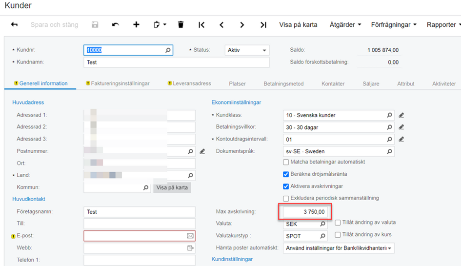 Det första vi gör nu är att gå till kundkortet (Kundreskontra – Register – Kunder) söker fram kunden och under fliken ”generell information” bockar för Aktivera avskrivningar samt fyller i maxbelopp för avskrivning (det bör täcka fakturabeloppet)