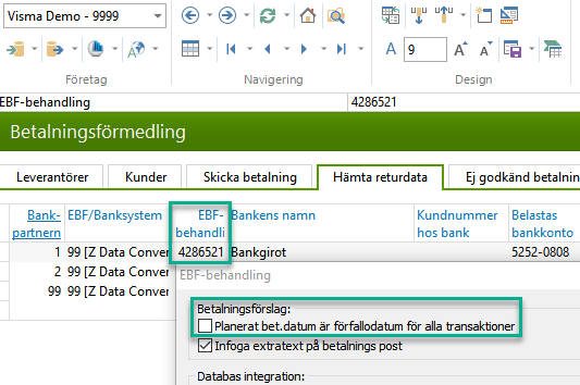 I bankpartnertabellen under "Hämta returdata" finns kolumnen "EBF-behandling". Här kan du ställa in om det ska vara kolumnen "Planerat bet.datum" eller "Förfallodatum" på den öppna posten som styr när betalningen ska gå igenom på banken. Har du nedan ibockat kommer betalningen ske det datum som står i "Planerat bet.datum".
