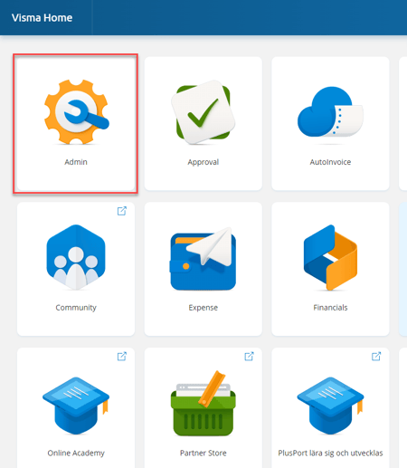 Steg 1 - Gå till Admin som finns att välja i Visma Home