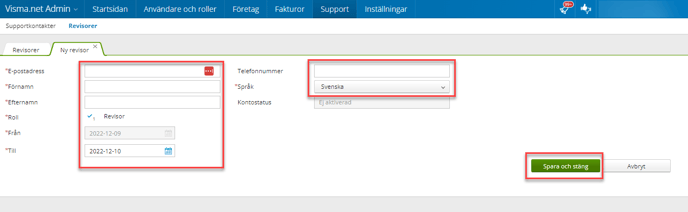 Efter dessa uppgifter är ifyllda så trycker ni på "Spara och stäng". Därefter kommer revisorn ha tillgång till ert bolag.