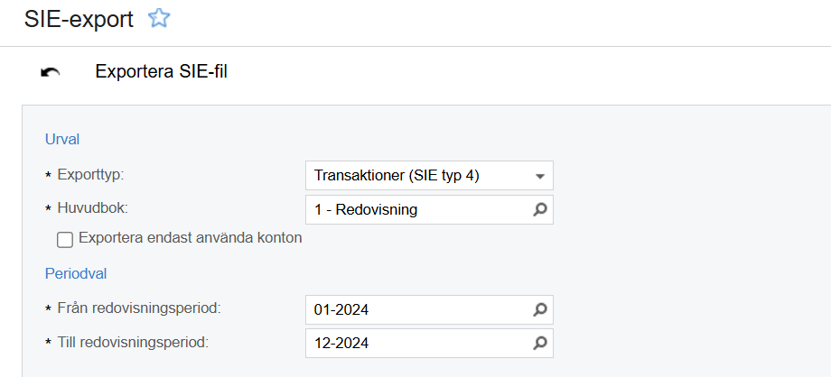 - Om du väljer Årssaldon (SIE typ 1) visas endast "räkenskapsår" under "periodval".