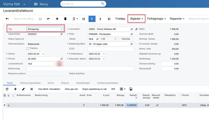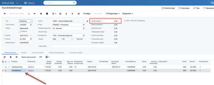 På betalningsraderna hämtar man kreditfakturan och debetjusteringen. Innan man frisläpper betalningen bör man kontrollera att betalt belopp är 0:-. Ser allt rätt ut så sparar man och frisläpper betalningen och då är både kreditfakturan och debetjusteringen stängda.