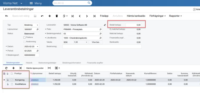På betalningsraderna hämtar man kreditfakturan och korrigeringen. Innan man frisläpper bör man kontrollera att betalt belopp är 0:-. Ser allt rätt ut så sparar man och frisläpper betalningen och då är både kreditfakturan och korrigeringen stängda.