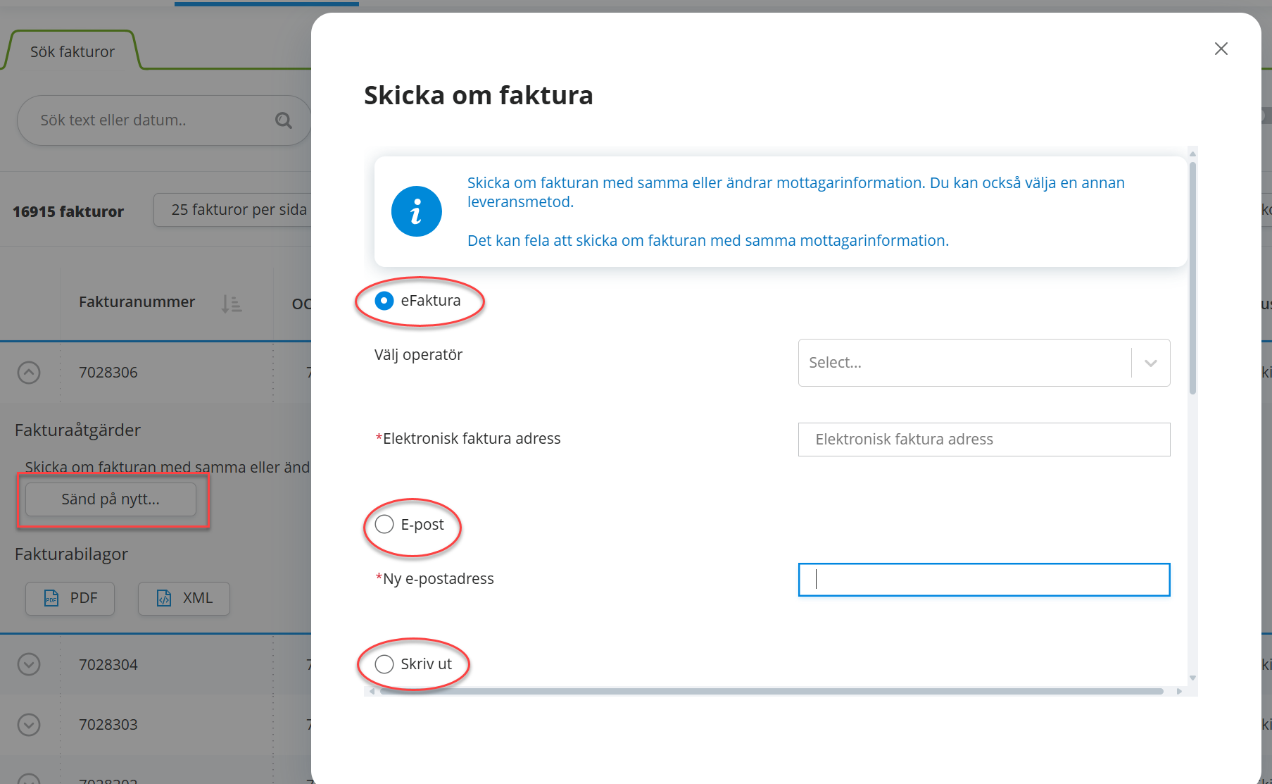- Där kan man välja om man vill skicka fakturan som e-faktura, via e-post eller skriva ut och skicka som vanlig post.