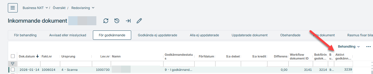 Om en kund skickar in och frågar varför ett dokument har fått behandling 8 så börja med att identifiera vilket Aktivt godkännandeärende som den tillhör. Det gör du genom att plocka fram kolumnen Aktivt godkännandeärende.