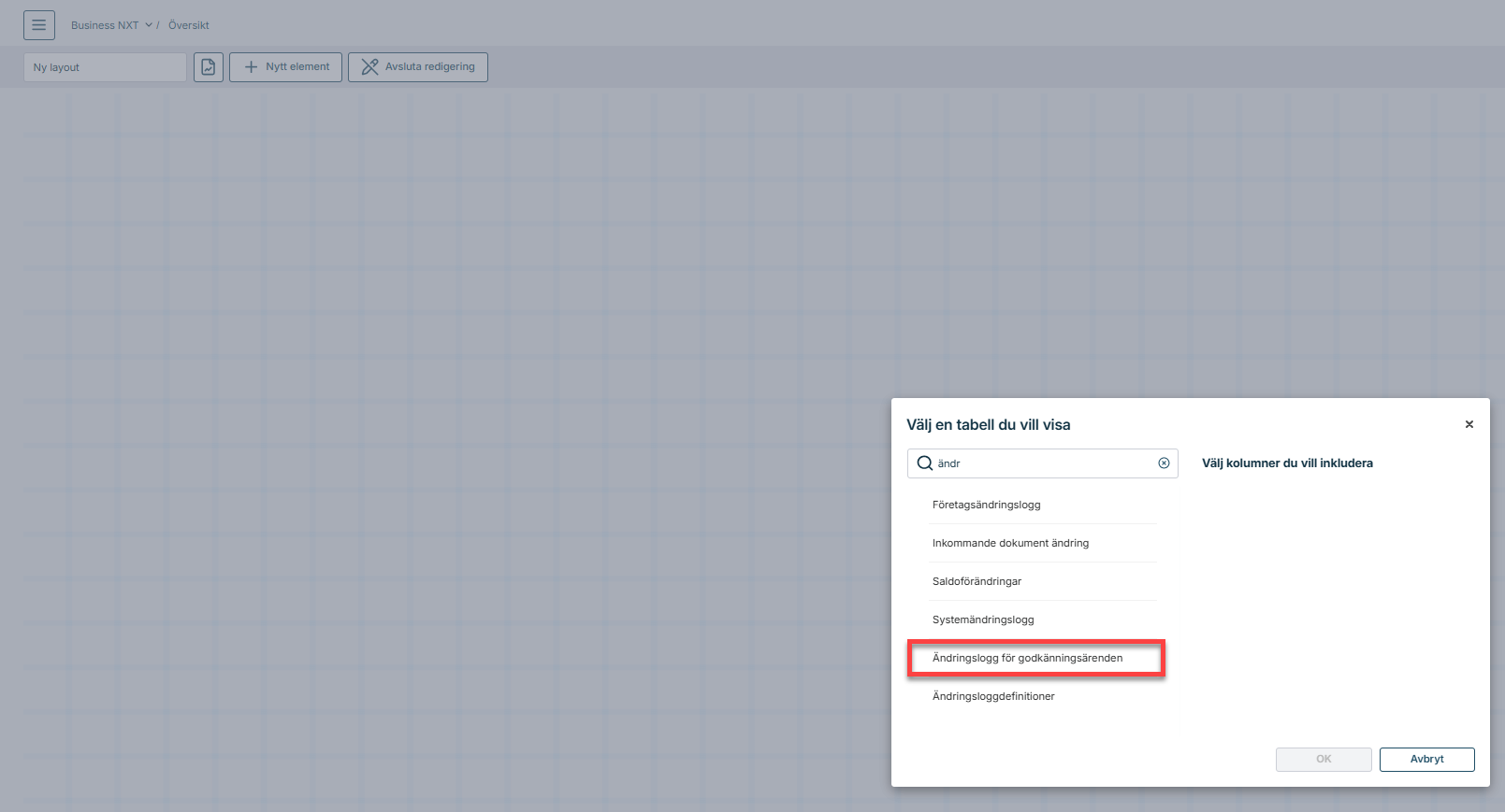 Därefter plockar vi fram en ny tabell och tar fram tabellen Ändringsloggen för godkänningsärenden.